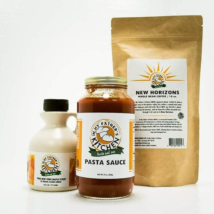 In My Father’s Kitchen (IMFK) developed a product to raise money for their non-profit work with the homeless in Syracuse, NY. They provided a company brochure and asked that artwork and layout of their product label mirror that of the brochure. In all, after the production of this label, several other products were created. These products include coffee beans and maple syrup. They support their lifesaving efforts.